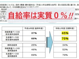 これが、いまの日本の危うい状況です。食糧自給率はカロリーベースで37%とされています。この数字が大きいか小さいかという議論は、まったく意味がありません。もう一つ、生産額ベースの自給率という統計もあって、こちらは66%あります。「だから日本は自給率が高い」という人がいます。しかし、これも真っ赤なウソです。なぜなら、実質的な自給率はほぼゼロ%だからです。これは、消費者はおろか、生産者でさえ理解していません。